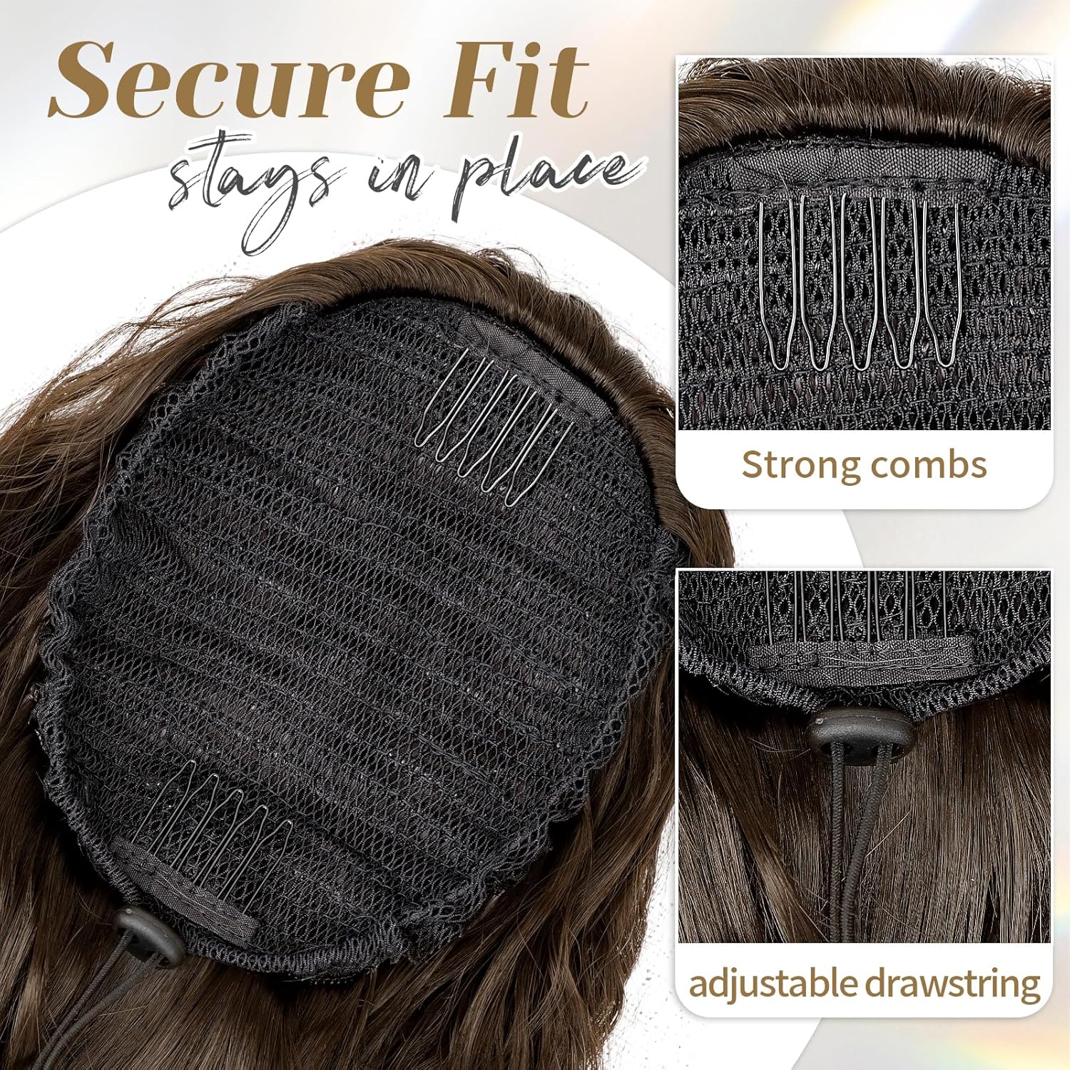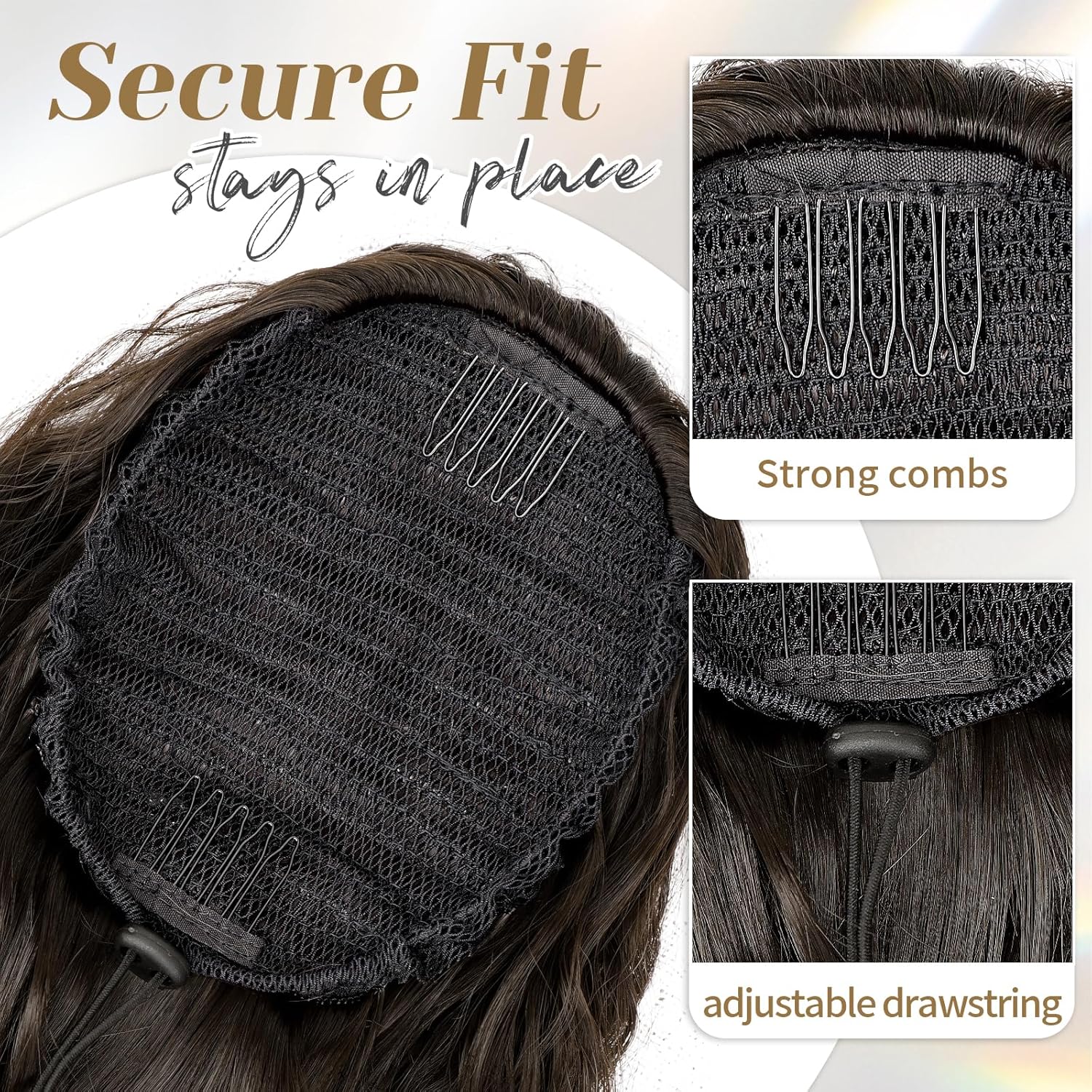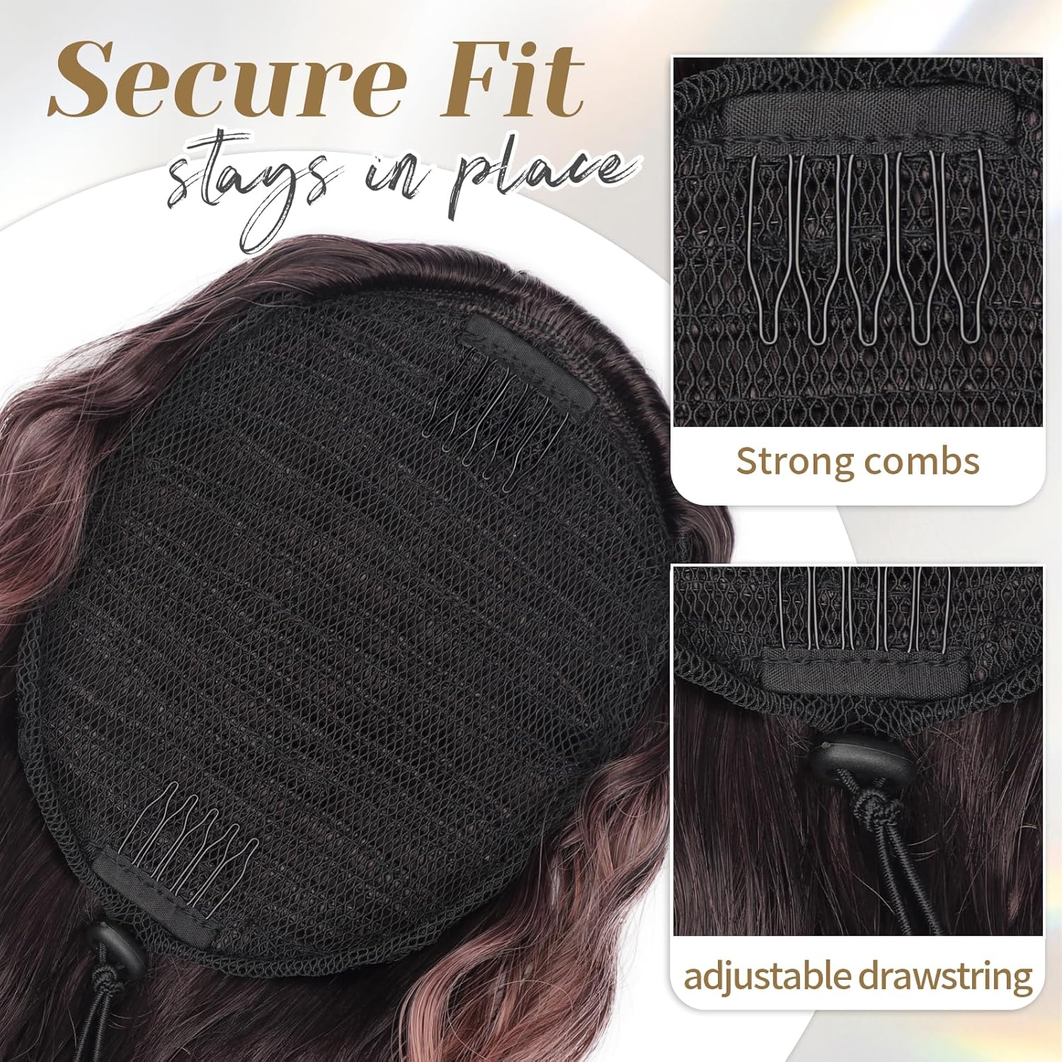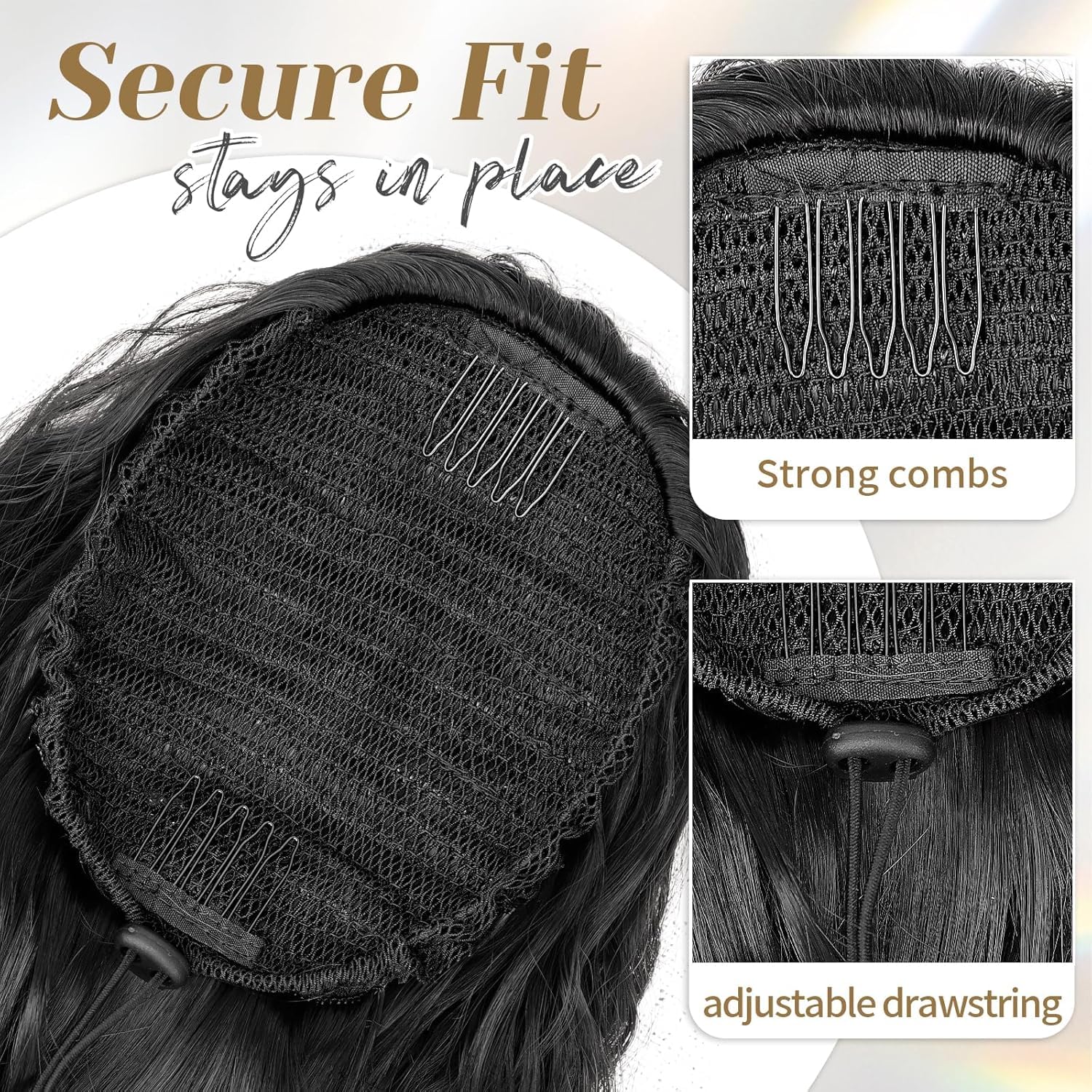 Put it on in just three quick steps—no salon needed. With two built-in combs and a strong elastic drawstring, it stays secure all day without slipping.