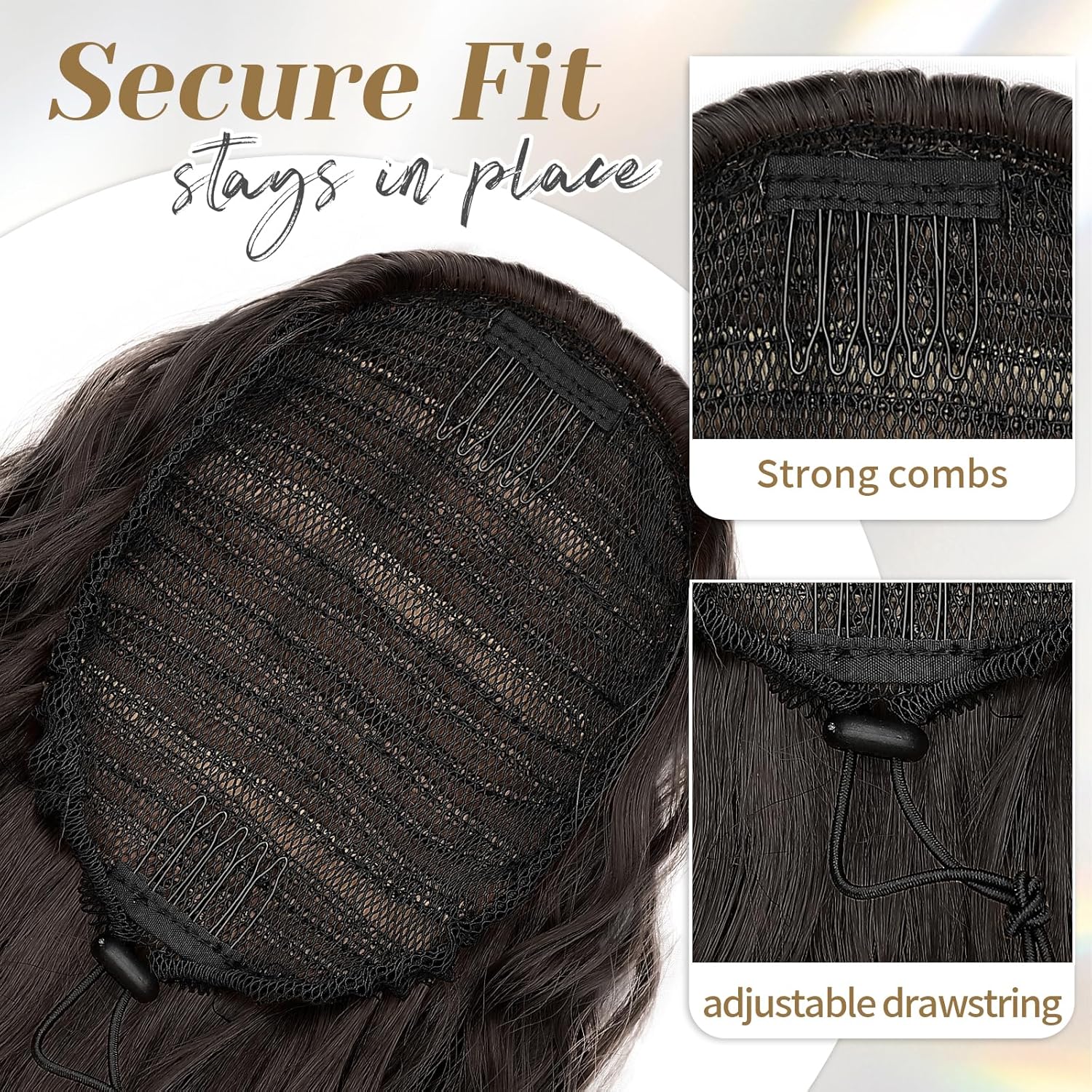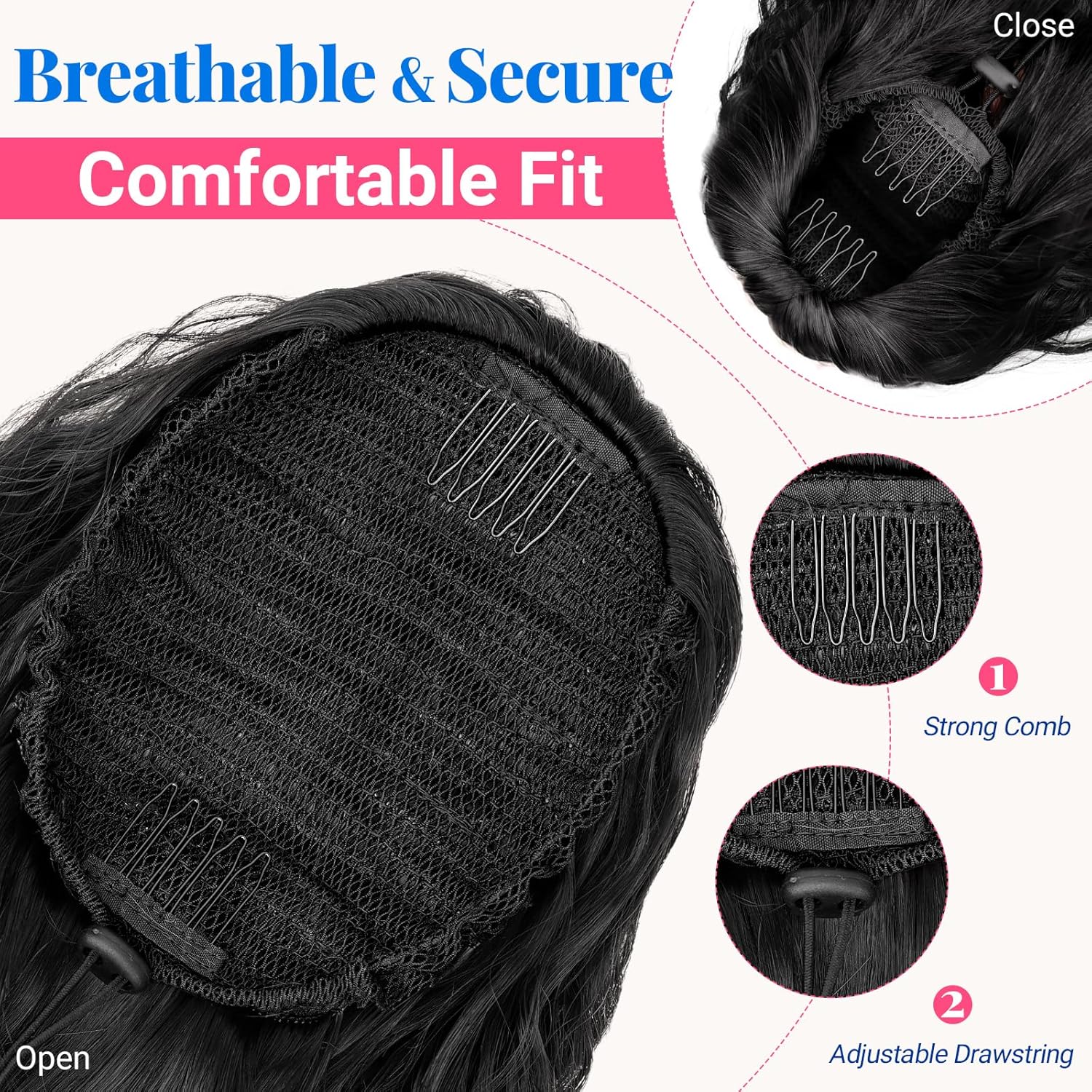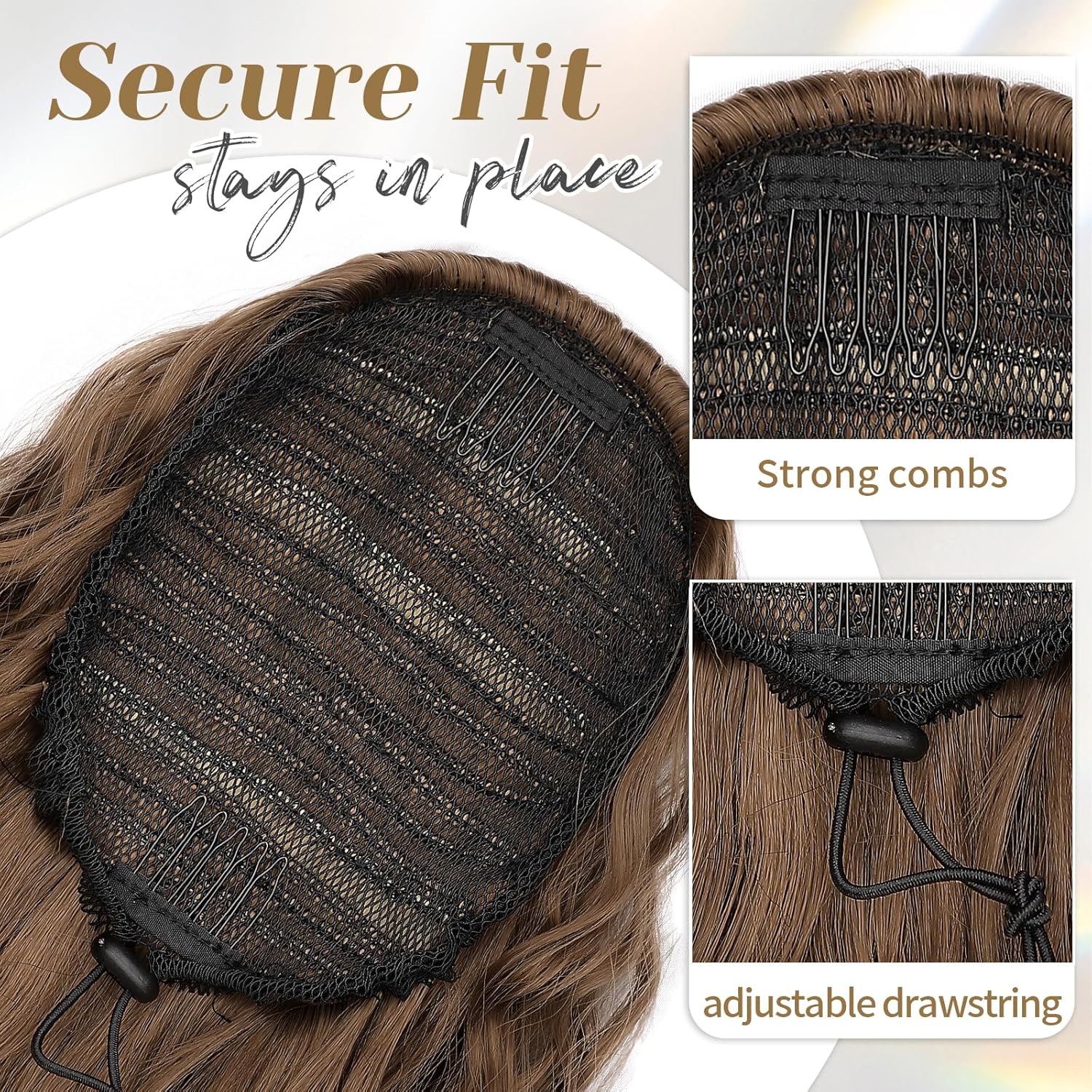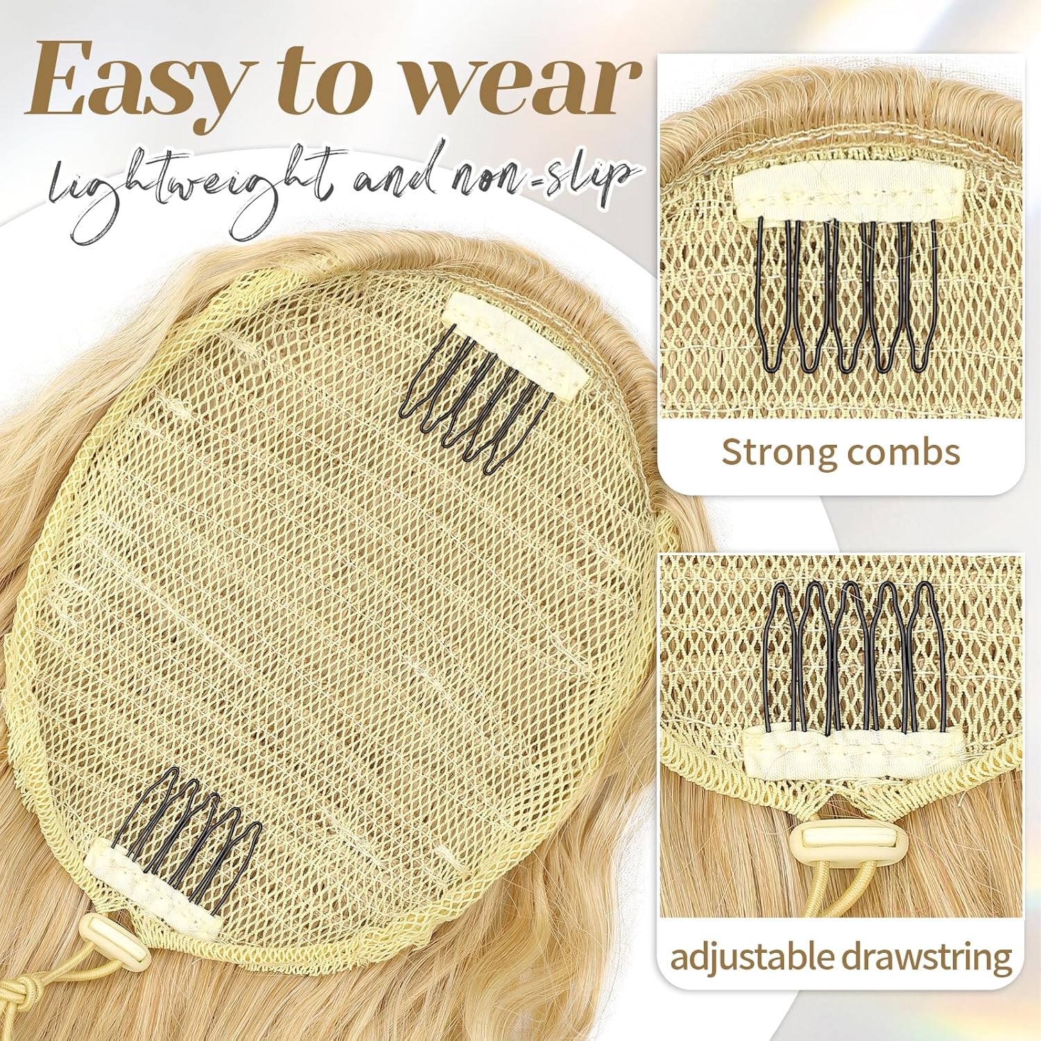 Put it on in just three quick steps—no salon needed. With two built-in combs and a strong elastic drawstring, it stays secure all day without slipping.