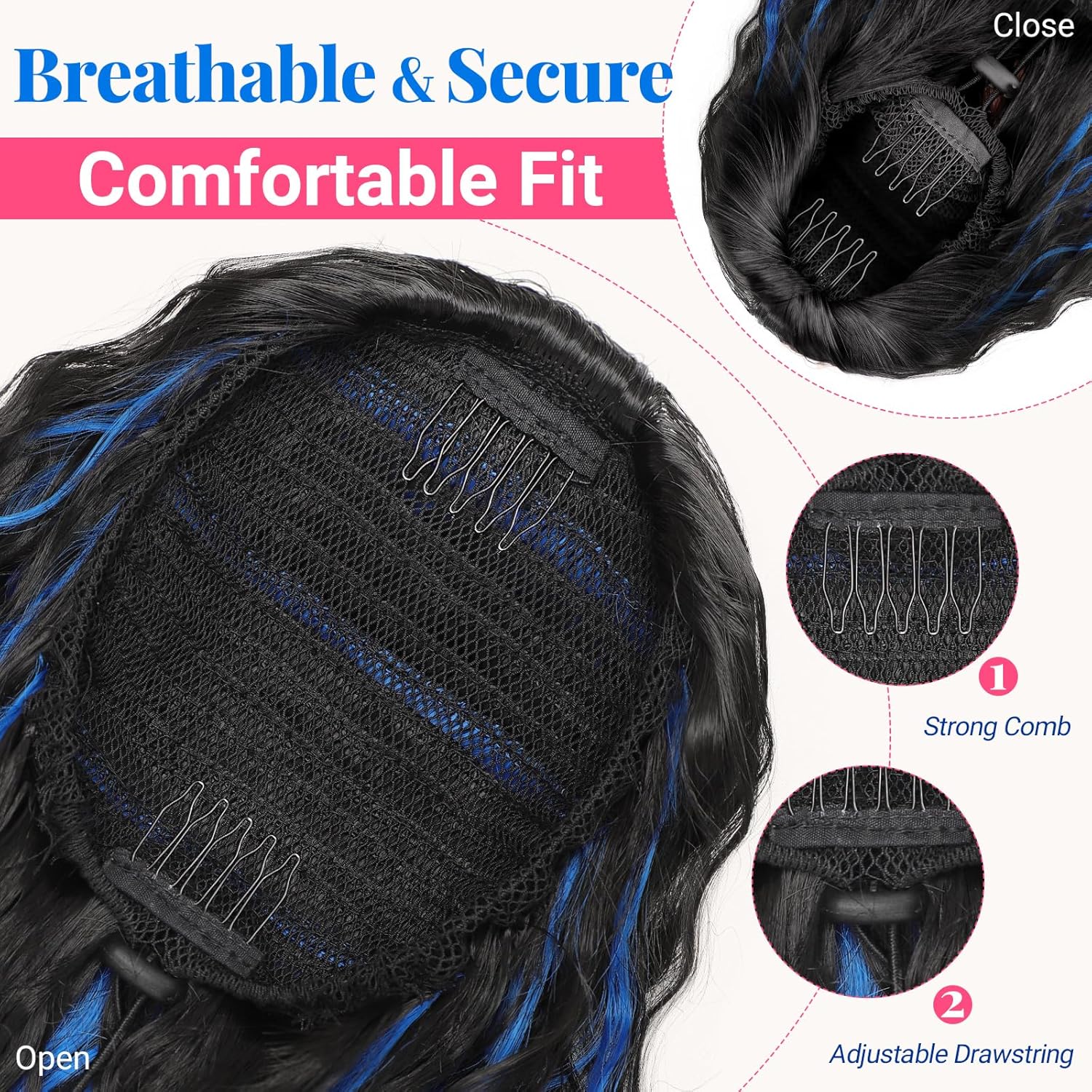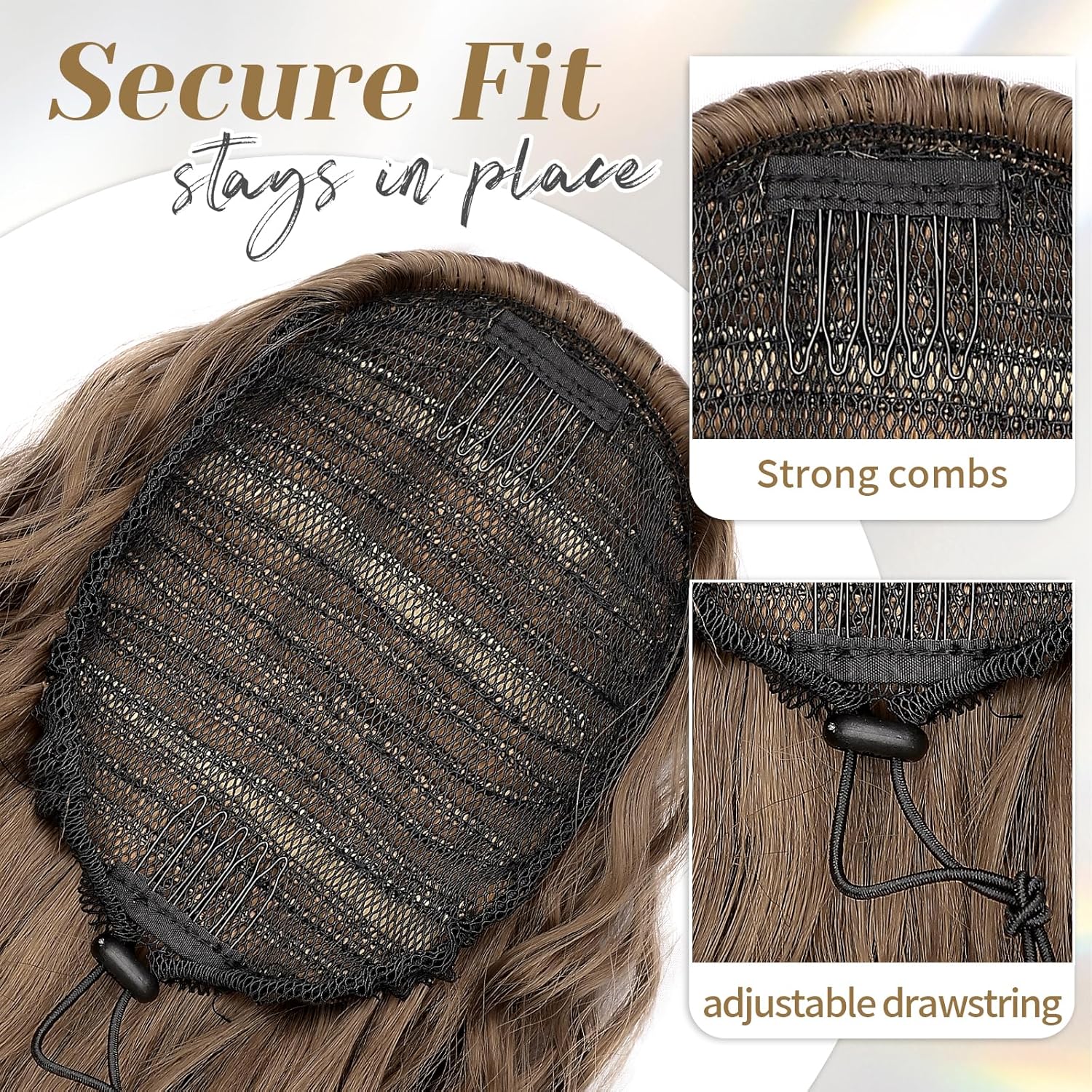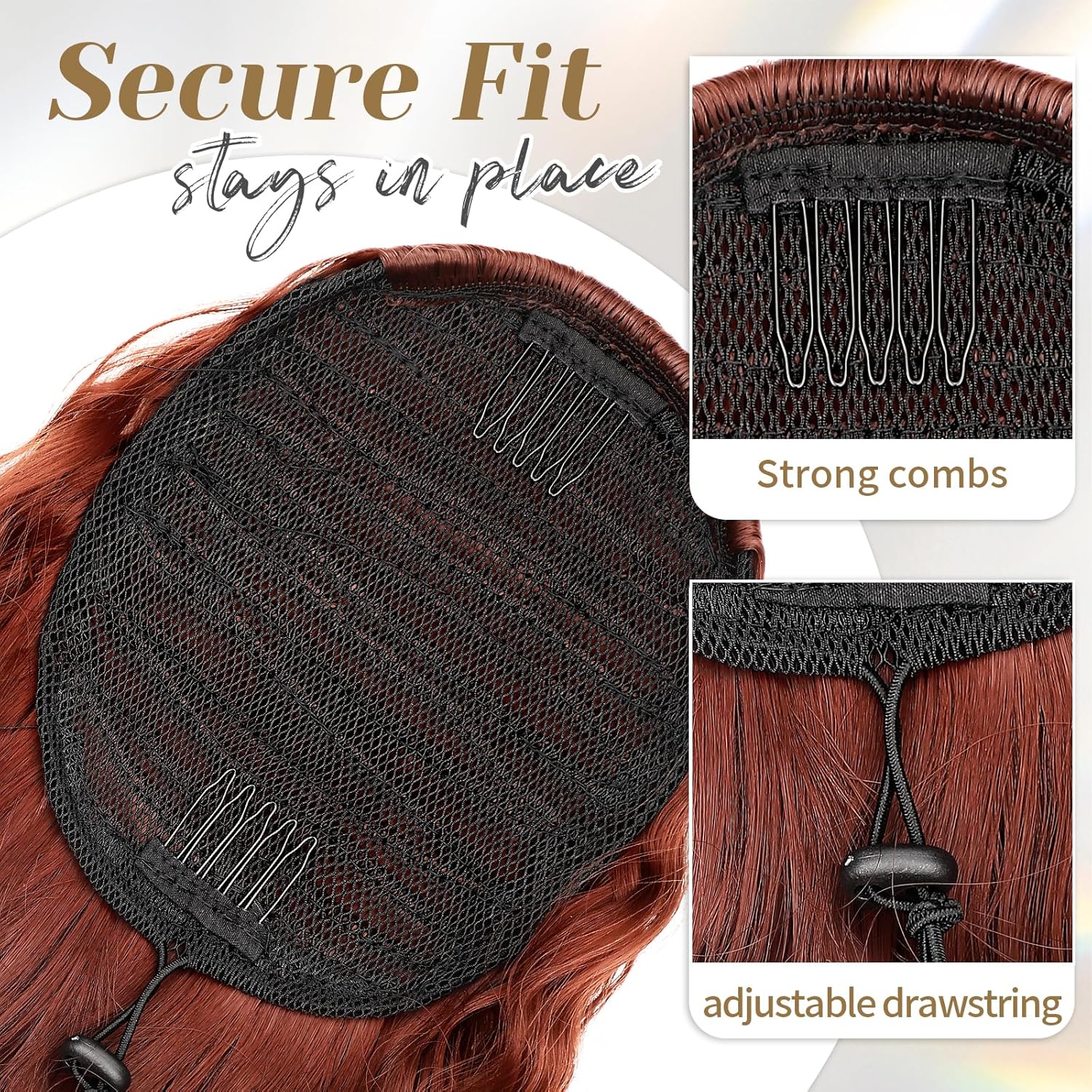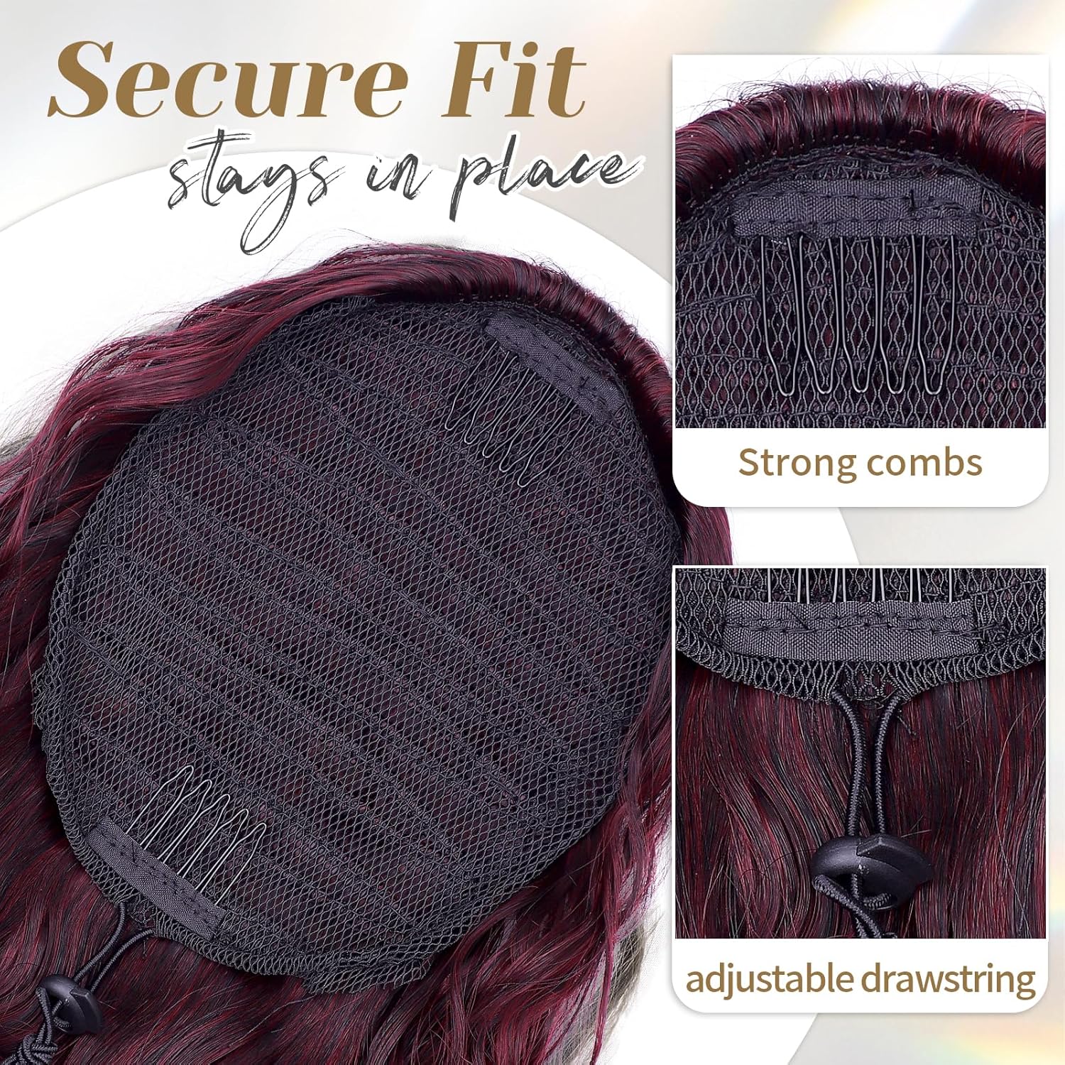 Put it on in just three quick steps—no salon needed. With two built-in combs and a strong elastic drawstring, it stays secure all day without slipping.